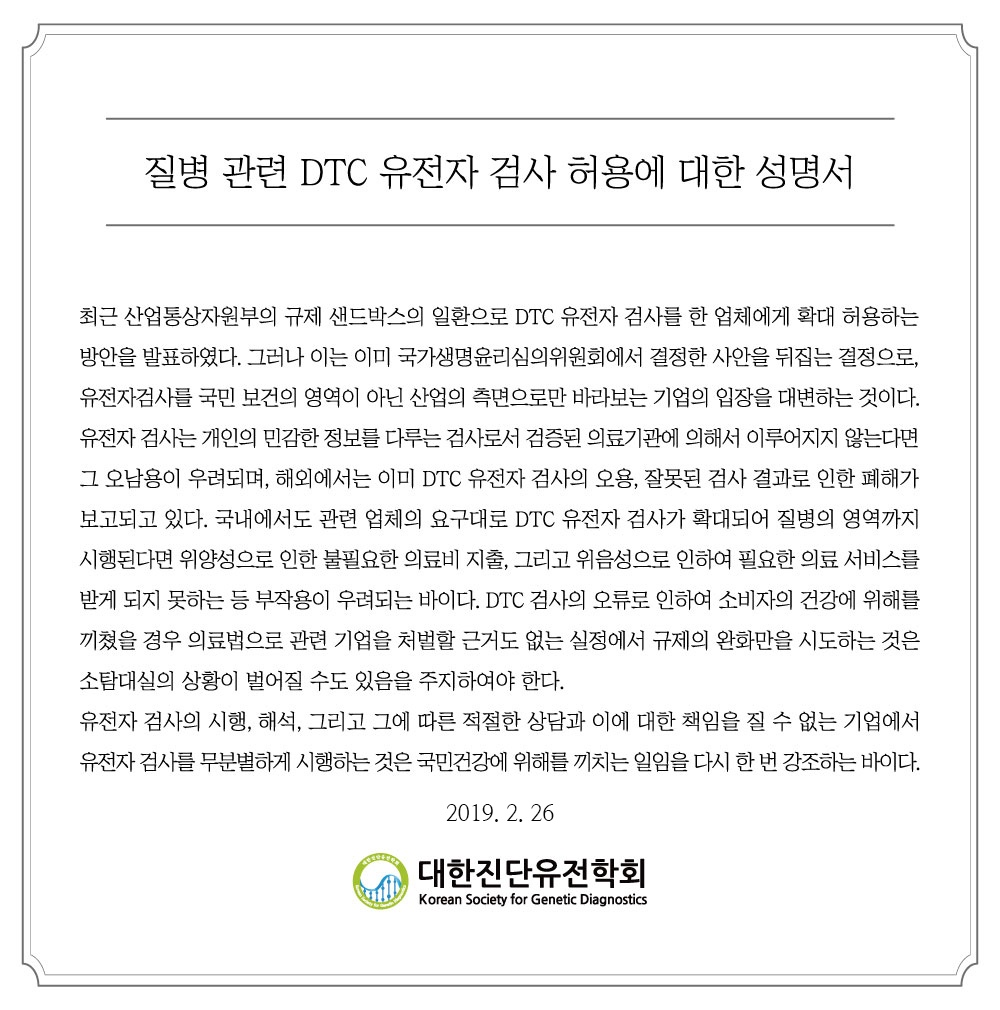 질병 관련 DTC 유전자 검사 허용에 대한 성명서 발표