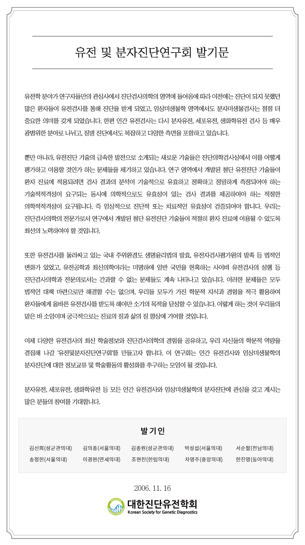 유전및분자진단연구회 발기문