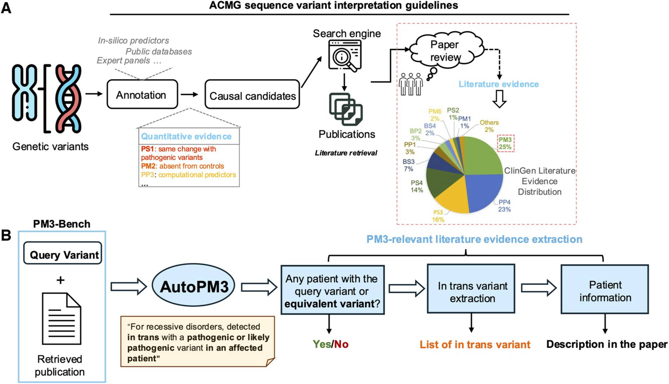 Text2SQL을 이용한 변이 추출과 거대언어모델(LLM)의 retrieval-augmented generation (RAG) module을 이용하여 문헌의 테이블과 본문에 나온 변이의 PM3 해당 여부를 판독하는 AI-assisted variant interpretation 모델입니다. 향후 이러한 도구들이 다양하게 개발될 것으로 예상되며, 전문가로서 정확도의 판단이 중요할 것으로 생각된다.