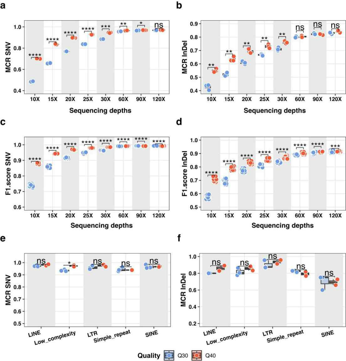 <그림 2> Germline SNV and InDel calling performance (Q30 vs. Q40).